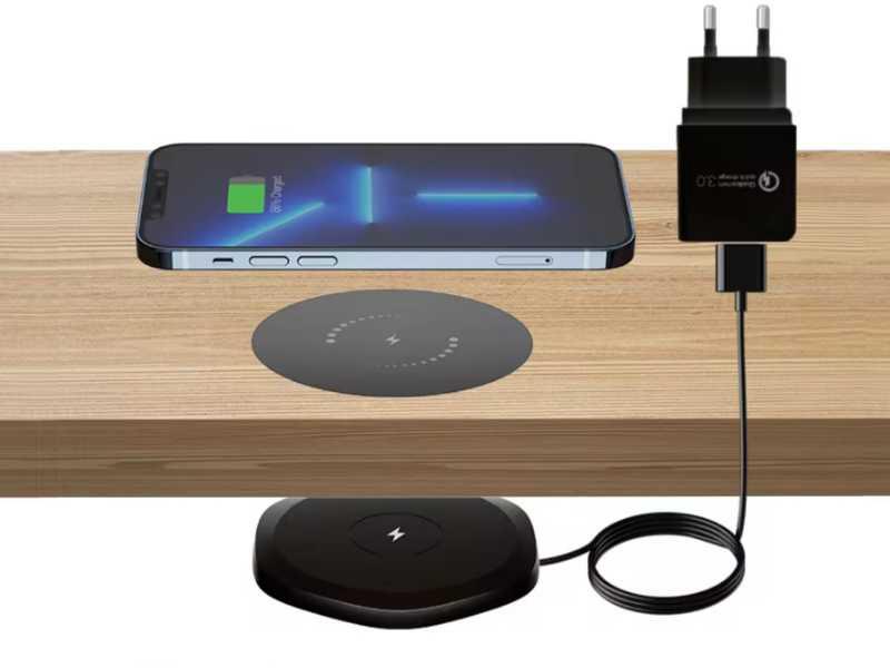 Unlike traditional wireless chargers that sit on top of your desk, this charger mounts underneath your desk or table, making it completely invisible. Just place your phone on the charging area, and it starts charging automatically.